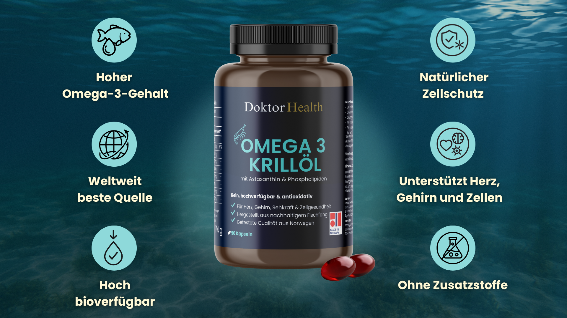 Krill wird in den klaren Gewässern der Antarktis gefangen, fernab von Umweltbelastungen. Die Gewinnung erfolgt nachhaltig und ist MSC-zertifiziert. Das macht Krillöl zu einer reinen und ethisch verantwortungsvollen Omega-3-Quelle.
